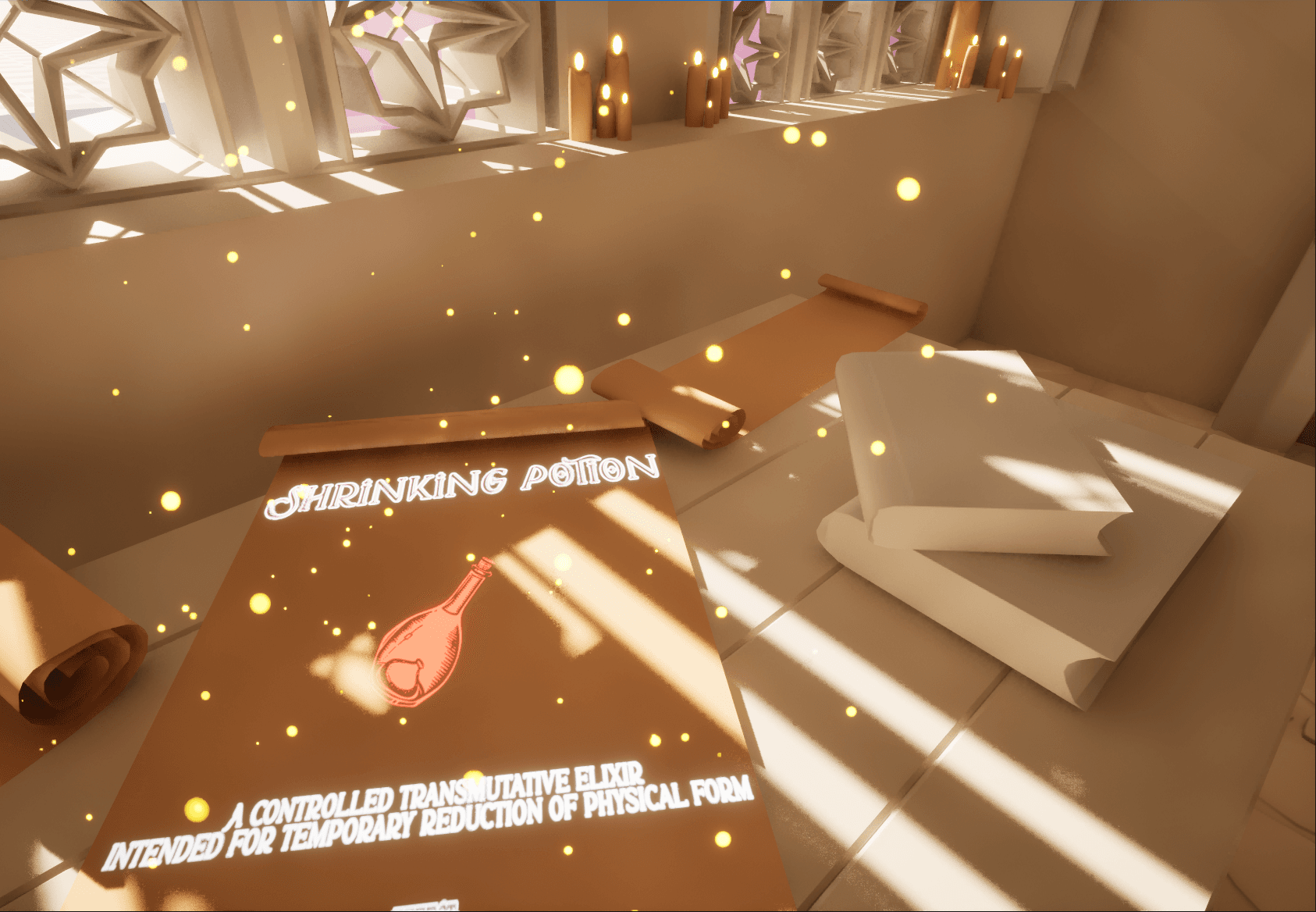 Progression is achieved through observation, environmental cues, and repeated color language linking the manuscript, the potion vial, and the miniature door.