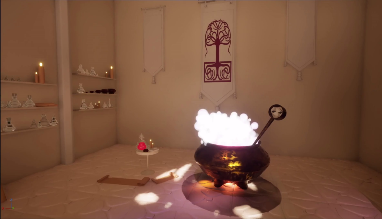 Darker tones and contrast balance the brightness of the desk. A red potion vial near the cauldron visually matches the red glow inside the miniature door.