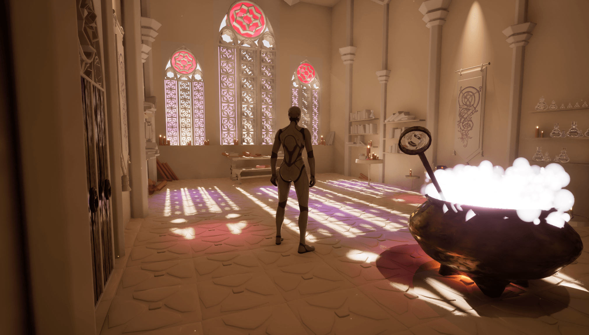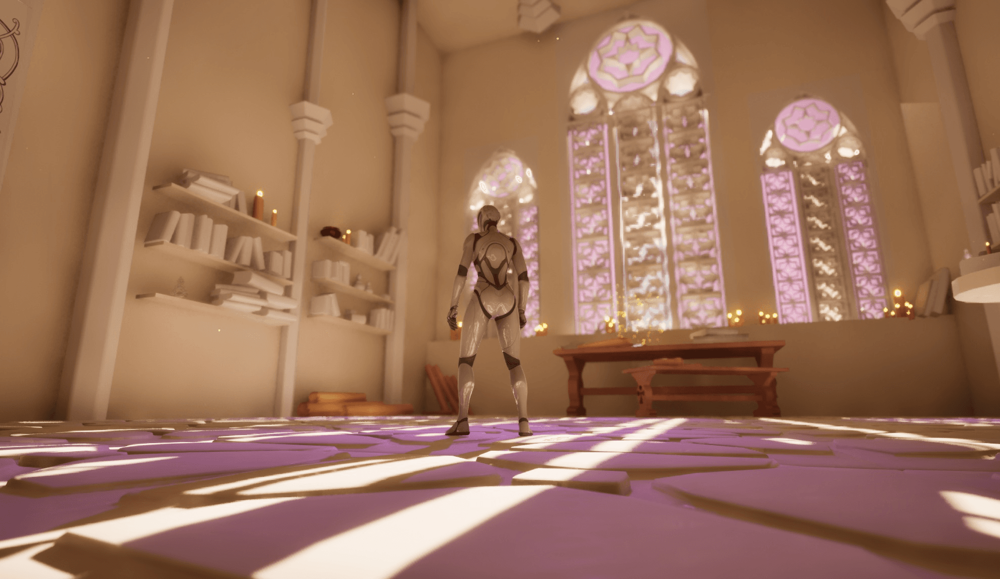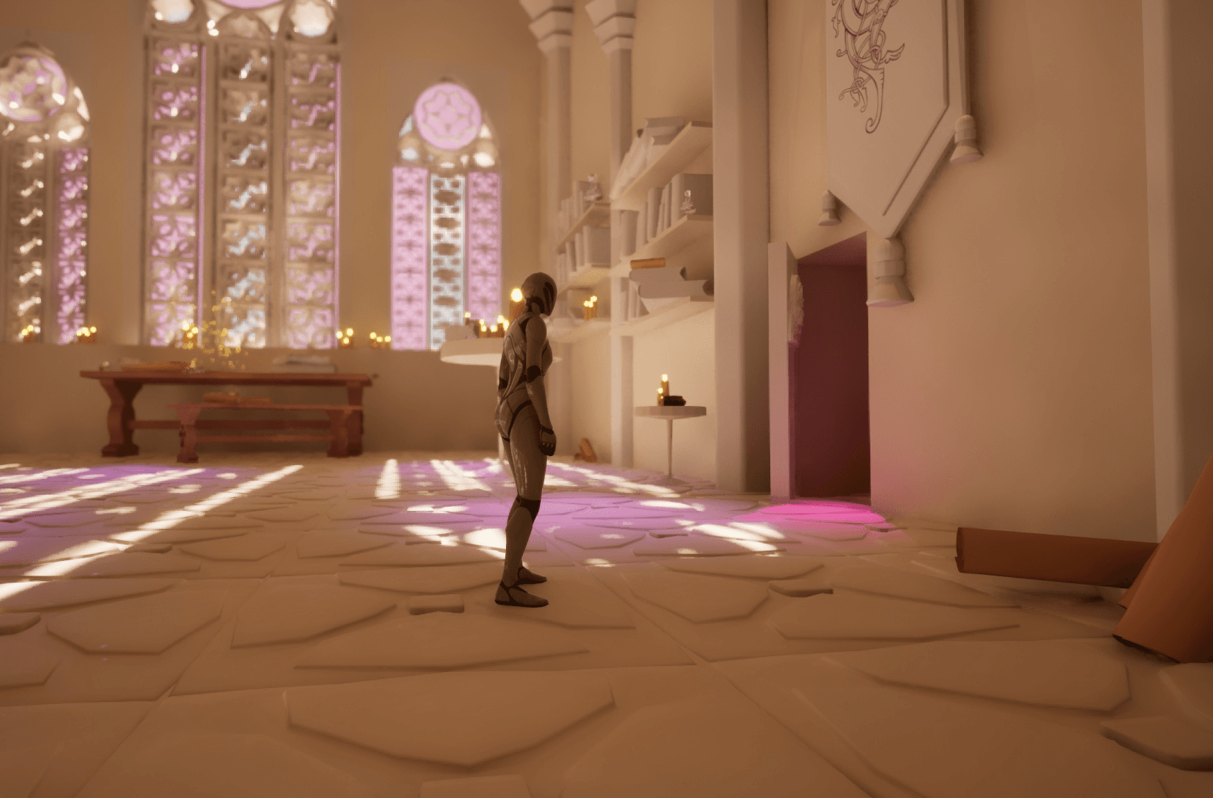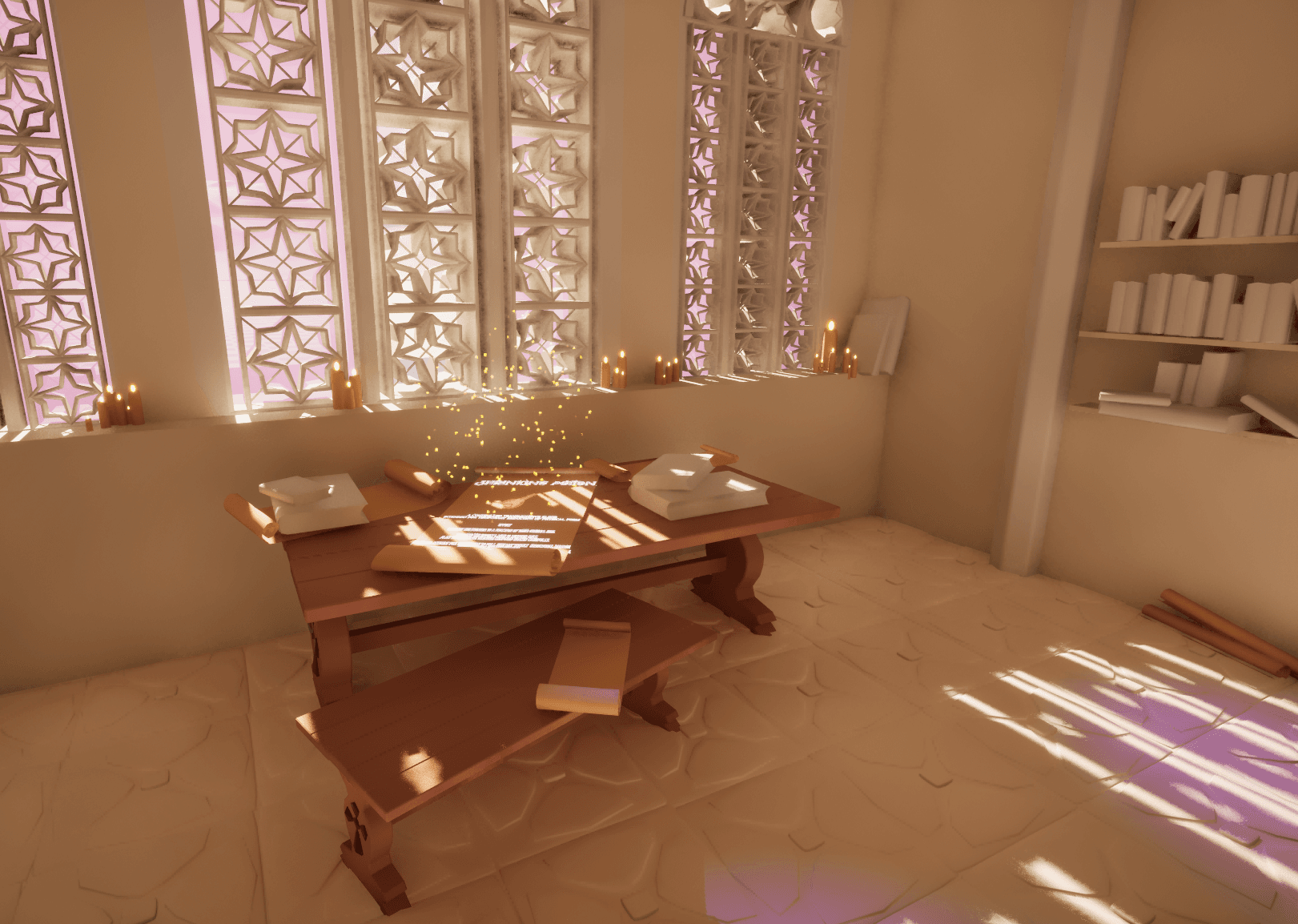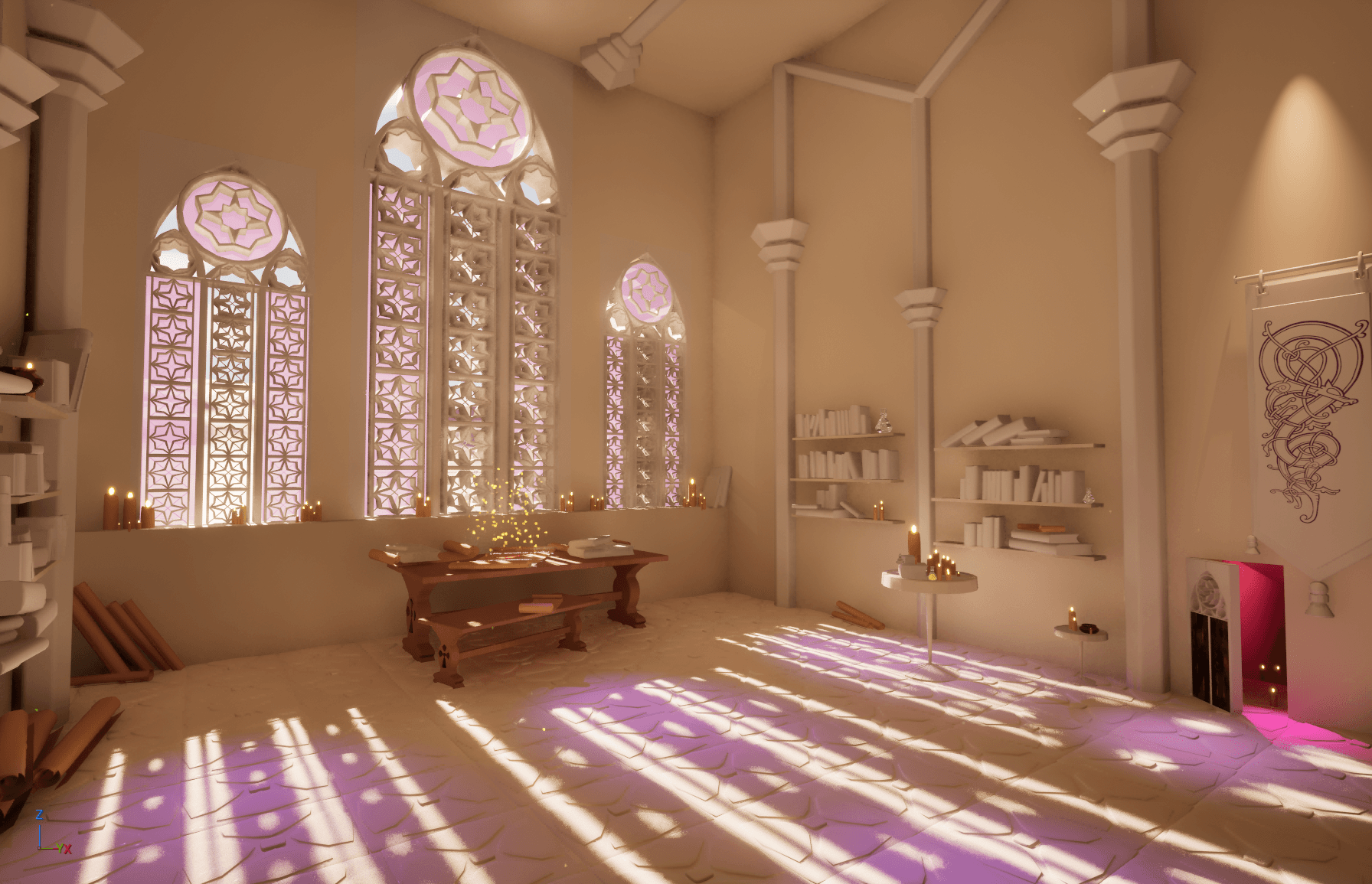 Light from the stained-glass windows directs the player toward the manuscript on the table. This area represents narrative information and explanation.