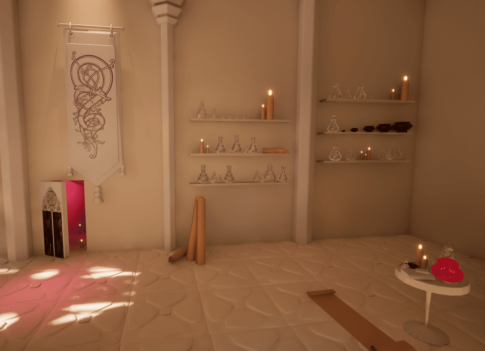 The room is designed as a safe, warm magical sanctuary — a reward space that contrasts with the tension of the previous traversal.