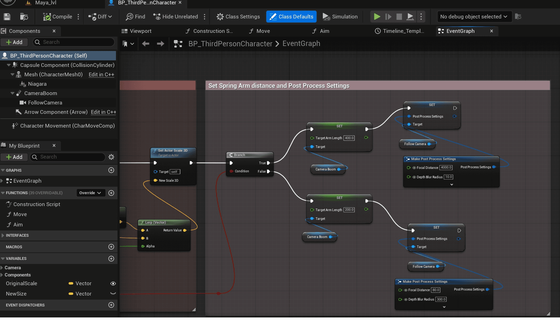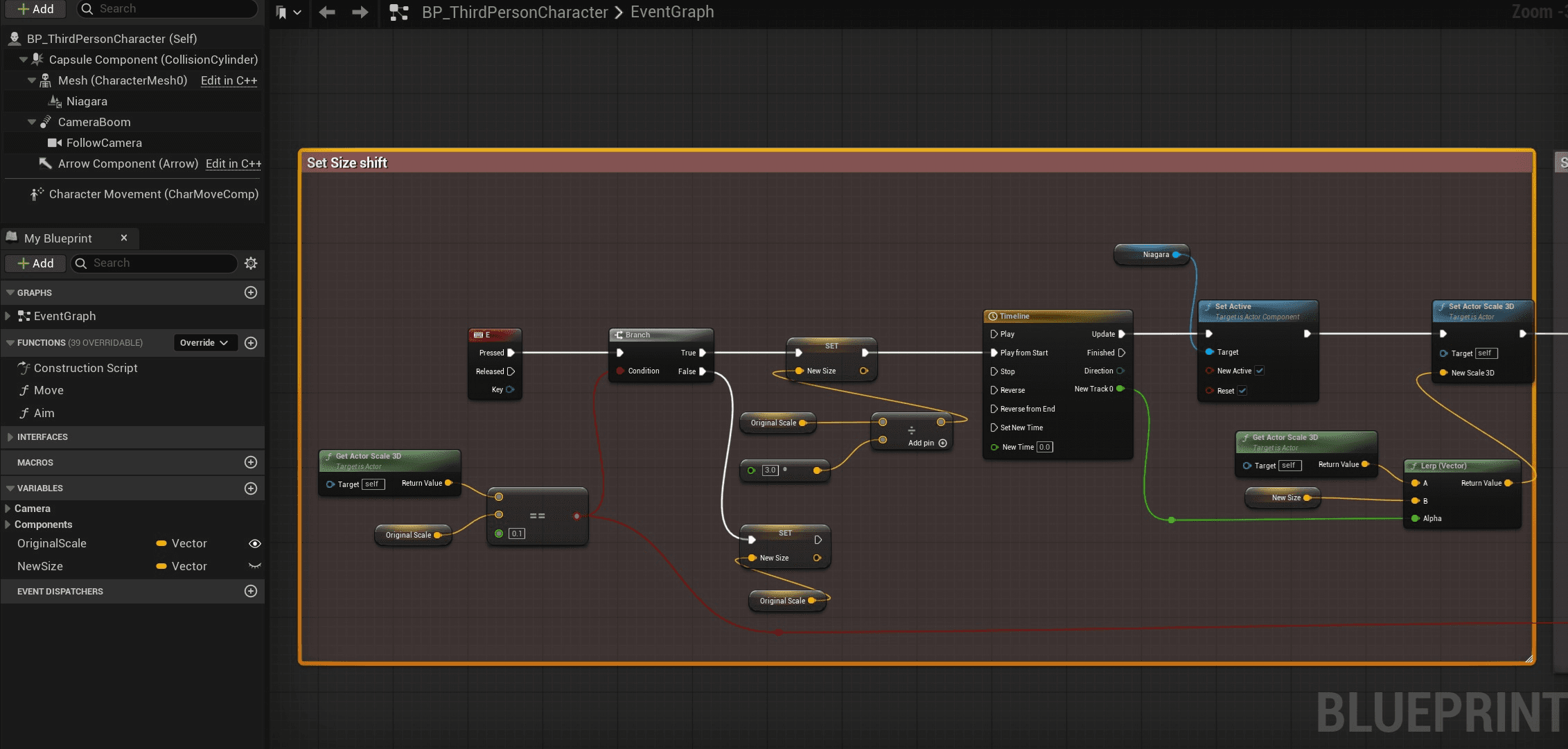To further reinforce the sense of scale, I applied a post-process depth of field effect that subtly blurs distant geometry when the character is in the shrunk state. This visual treatment helps emphasize how small the player has become and shifts the player's perception of the surrounding environment.